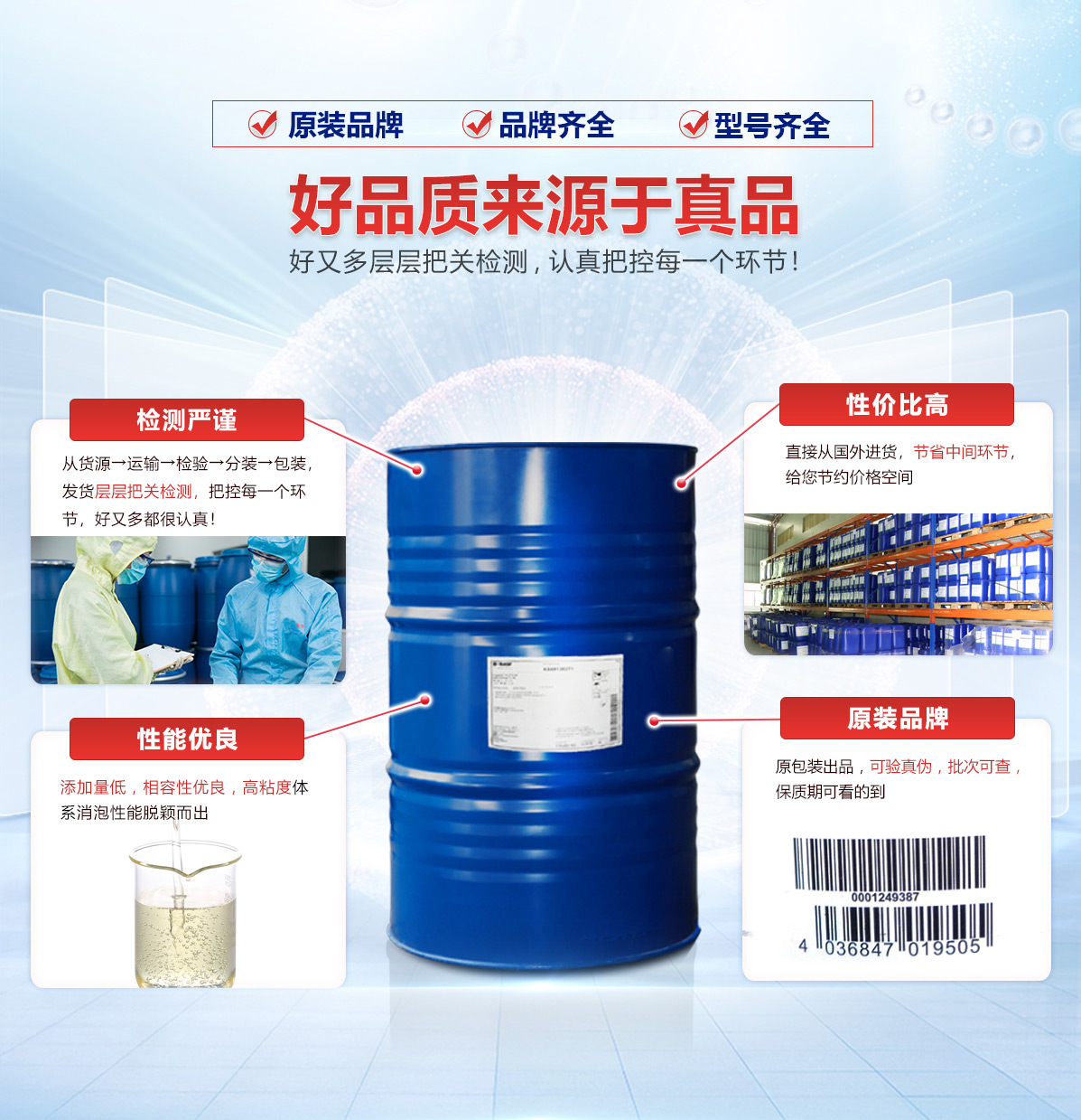 產品特點:適合多種乳液體系的涂料、油墨和粘合劑用廣譜消泡劑;具有極佳的涂膜相容性,故可達到高透明,無瑕疵涂膜;具有持久的消泡能力,不管是持久性泵送還是長期儲存,均能保持良好的消泡性能。